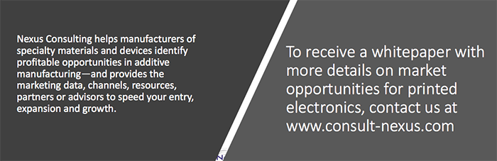 Nexus specializes in supporting new product development and new market entry projects relating to printed & flexible electronics, wearable electronics, additive manufacturing and functional materials to support these areas. Our services are designed to provide a framework for new business development, assisting clients in making good decisions on product/market fit. Typical areas of assistance include value proposition development, market channel analysis, market opportunity assessment and introduction to potential customers and supply chain partners.
