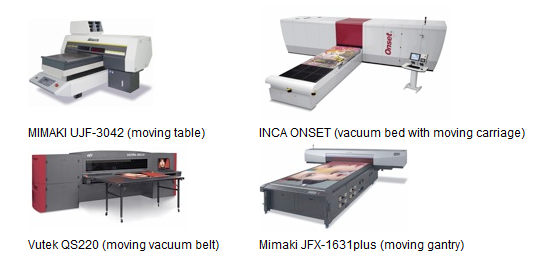 There are a few types of flatbed devices. The basic system is where the media is fed past a traversing head unit by using a vacuum belt. Another is where a traversing head unit (Mimaki) is on a gantry that traverses down the length of the substrate. Yet another system (Inca Onset) uses a moving vacuum bed assembly that moves the substrate under an array of inkjet heads that index across the board's width. These devices can use either the mercury lamps for pinning and curing the UV ink, or they can use the LED UV-curing heads that accomplish the same curing action, but without the enormous heat generation and energy consumption. There are other flatbeds that have variations of these methods.