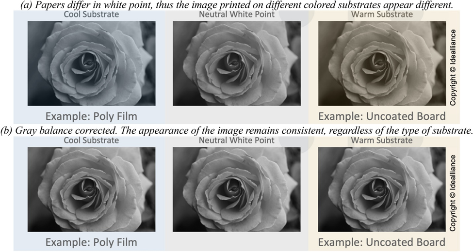 Moreover, the influence of paper color in the color printing applications is manageable by following procedures used for reproducing visually accurate colors, such as G7 (Copyright Idealliance and include G7 is a registered trademark of Idealliance), thanks to the grayscale colorimetric measurements between processes and/or various papers53. In general, papers differ in white point, thus images printed on different colored papers appear slightly different (Fig. 5a). Applying G7 calibration and process control methodology (Copyright Idealliance and include G7 is a registered trademark of Idealliance) and its Substrate Corrected Color Aim (SCCA) procedures, near neutral gray balance and common appearance on any substrate can be achieved (Fig. 5b)54. (source: Addition of fibers derived from paper mill sludge…, Bilge, et al.)