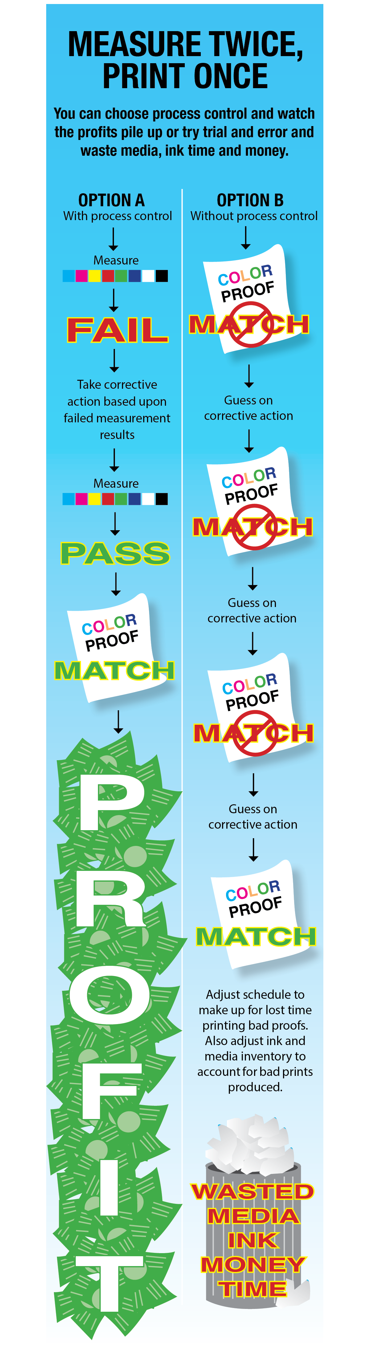 When you choose to implement process control into your color management strategy, you will ultimately save yourself money in ink and media, and save time by not having to repeat jobs.