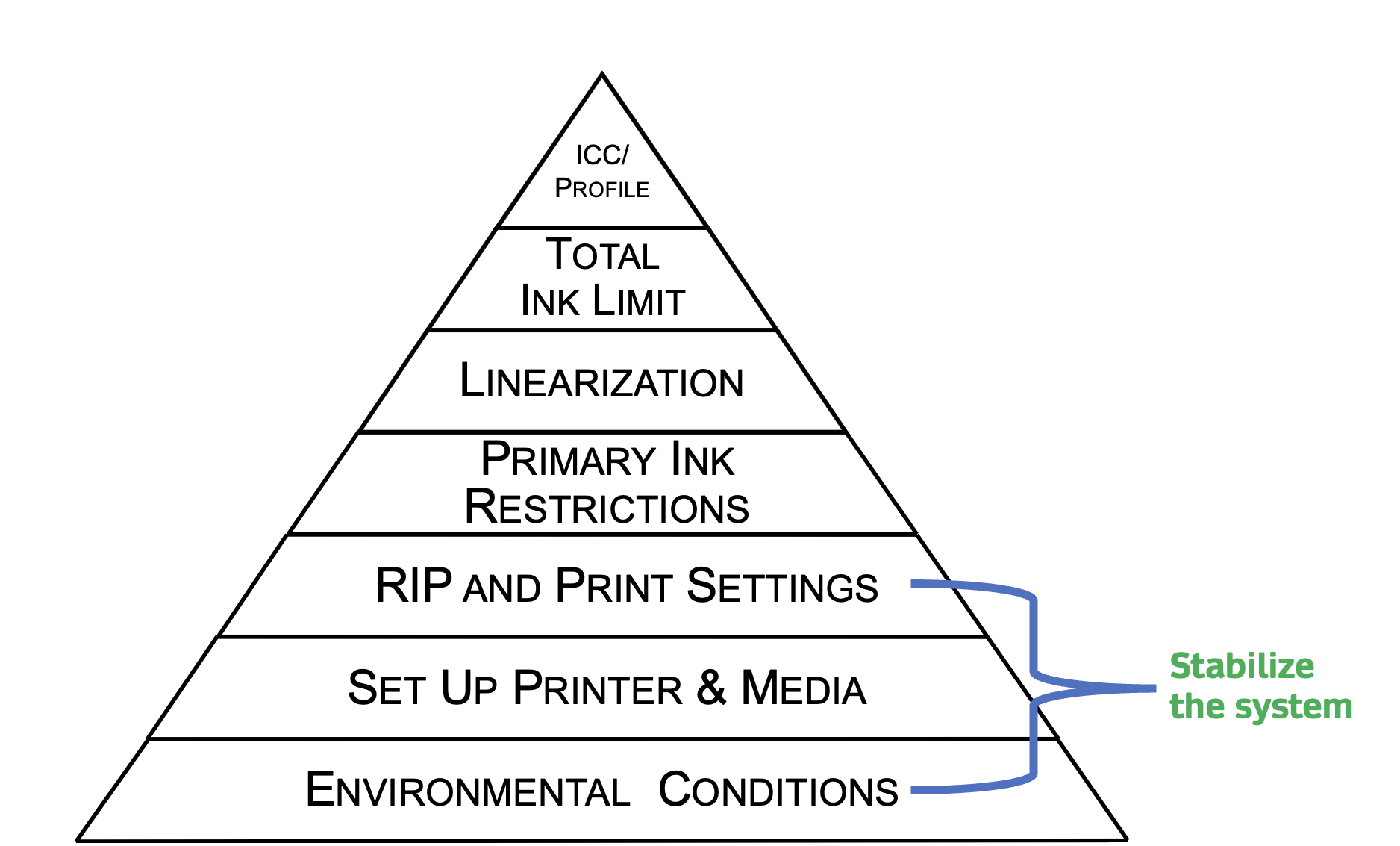 To use it, you start at the bottom of the pyramid and work your way up. The first three levels of the Color Management Pyramid are important elements of process control. We refer to it as stabilizing the system.