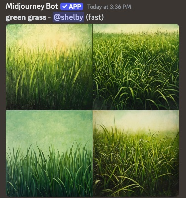 I’ve had to retrain my brain a little bit to think about how to describe color in word prompts. Not unexpectedly, when I simply used the prompt of “green grass,” I received the same amount of variance from Midjourney as I would if I was trying to describe it to people from different regions. (see image)
