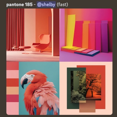 I picked a well-known Pantone 185 and simply entered that in the prompt to Midjourney. It was clear from the resulting image options (a flamingo, a series of chairs, some random artwork) that Midjourney couldn’t comprehend what exactly Pantone 185 was. (see image)