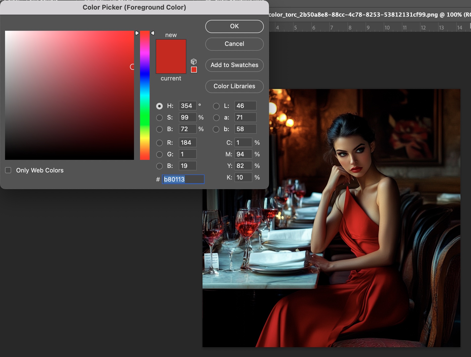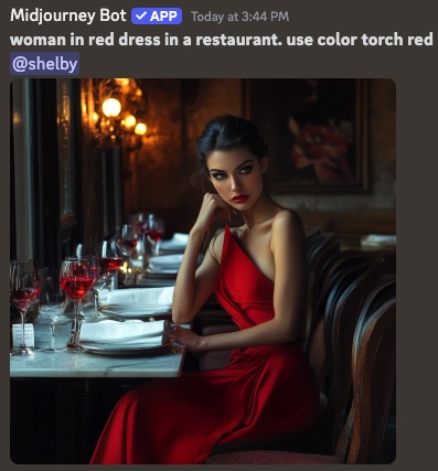 I returned to Midjourney and entered the prompt of “woman in red dress in a restaurant. use color torch red” and it resulted in an image with a much closer color to Pantone 185. I was able to verify its closeness – but not exactness – by opening the image in Photoshop and using the color picker to verify the red. (see images)