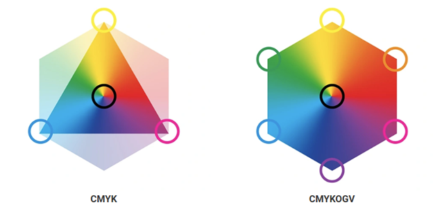 Four color (CMYK) vs. seven color (CMYK+OGV). Image courtesy of INX.