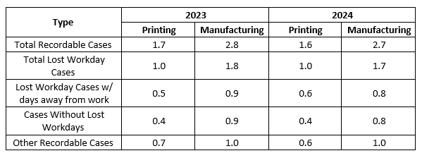 The new lower injury rate marks a two-year decline. The 2024 data demonstrates that the printing industry's injury and illness rates are among the lowest in manufacturing, maintaining its historical trend of safety.