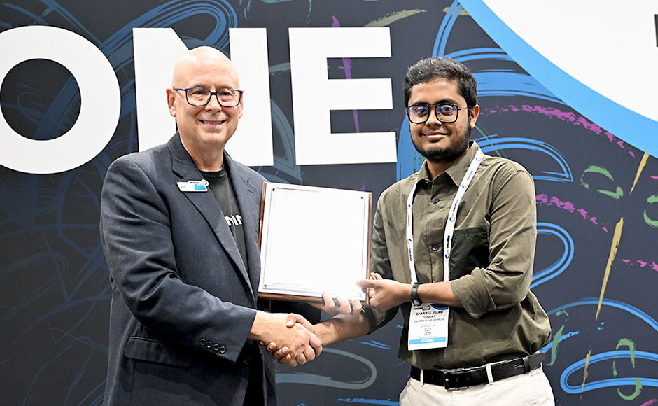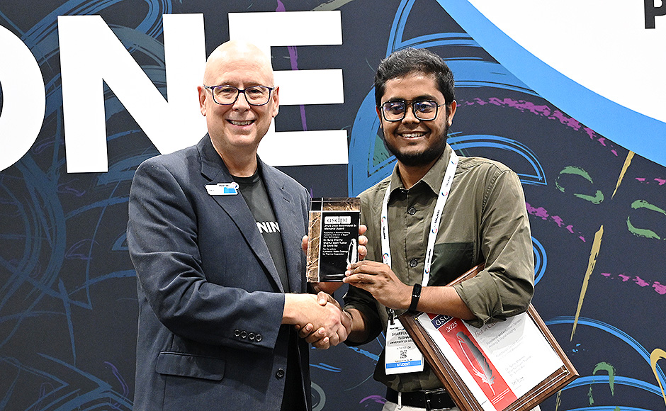 Dr. Suraj Sharma, Shariful Islam Tushar, and Dr. Smriti Rai were awarded the overall Swormstedt Award for their article Functional Textile Coatings for Thermal Regulation. Pictured accepting the award is Shariful Islam Tushar (R) and Ray Weiss (L).