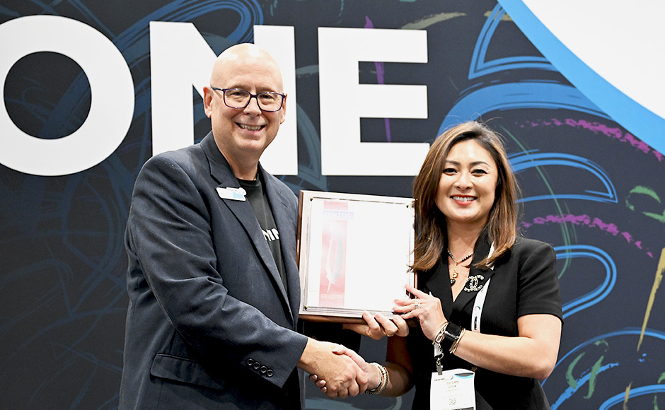 (First photo) Susan Cox (R) is shown accepting her Best-in-Class plaque for her article Understanding UV Printing Adhesion: Concepts, Tools, and Techniques. Presented by Ray Weiss (L).