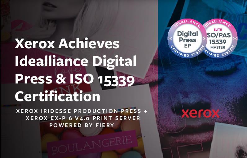 Idealliance is proud to announce that the Xerox® Iridesse® Production Press, paired with the Xerox EX-P 6 v4.0 Print Server Powered by Fiery®, has achieved the prestigious Idealliance Digital Press System Certification, along with the ISO/PAS 15339 System Certification. This accomplishment reinforces Xerox’s commitment to delivering cutting-edge print solutions with the highest standards in color quality, consistency, and process control. -