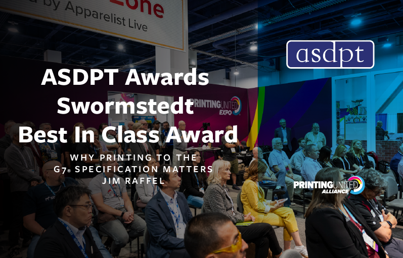 Jim Raffel, G7+ Trainer, and member of the Academy of Screen and Digital Print Technologies was awarded the Dave Swormstedt Sr. Memorial Award – Best in Class, for Graphics and Displays Digital Printing for his article Why Printing to the G7® Specification Matters. -