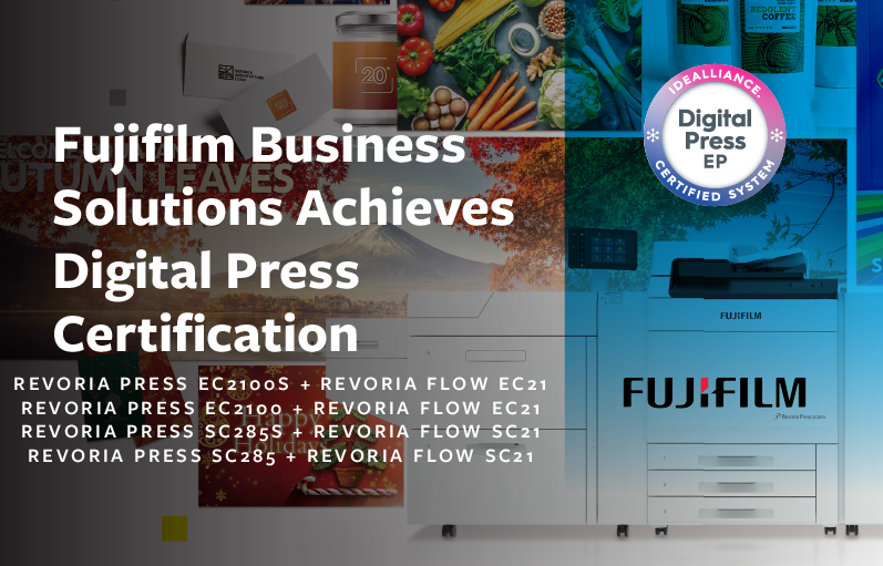 FUJIFILM Business Innovation’s digital presses demonstrating class-leading digital press capabilites and certified by Idealliance and PRINTING United Alliance. -